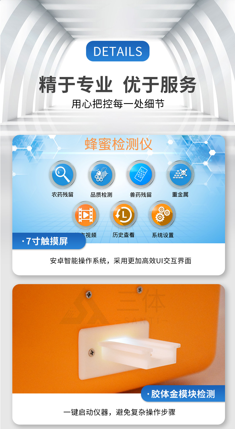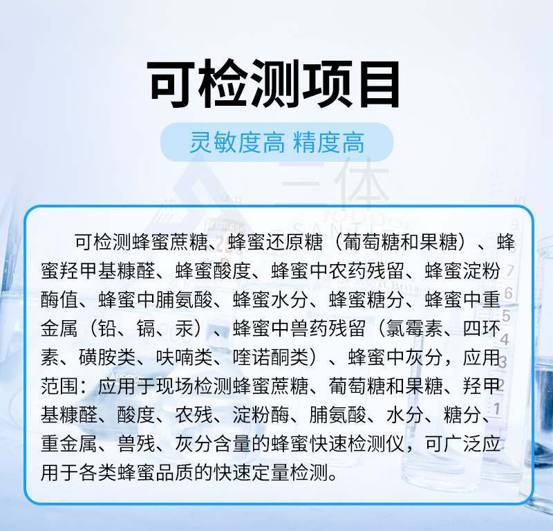 檢測(cè)項(xiàng)目:蜂蜜蔗糖、蜂蜜還原糖(葡萄糖和果糖)、蜂蜜羥甲基糠醛、蜂蜜酸度、蜂蜜中農(nóng)藥殘留、蜂蜜淀粉酶值、蜂蜜中脯氨酸、蜂蜜水分、蜂蜜糖分、蜂蜜中重金屬(鉛、鎘、汞)、蜂蜜中抗生素(氯霉素、四環(huán)素、磺胺類、呋喃類、喹諾酮類)、蜂蜜中灰分,應(yīng)用范圍:應(yīng)用于現(xiàn)場(chǎng)檢測(cè)蜂蜜蔗糖、葡萄糖和果糖、羥甲基糠醛、酸度、農(nóng)殘、淀粉酶、脯氨酸、水分、糖分、重金屬、抗生素、灰分含量的蜂蜜快速檢測(cè)儀,可廣泛應(yīng)用于各類蜂蜜品質(zhì)的快速定量檢測(cè)。