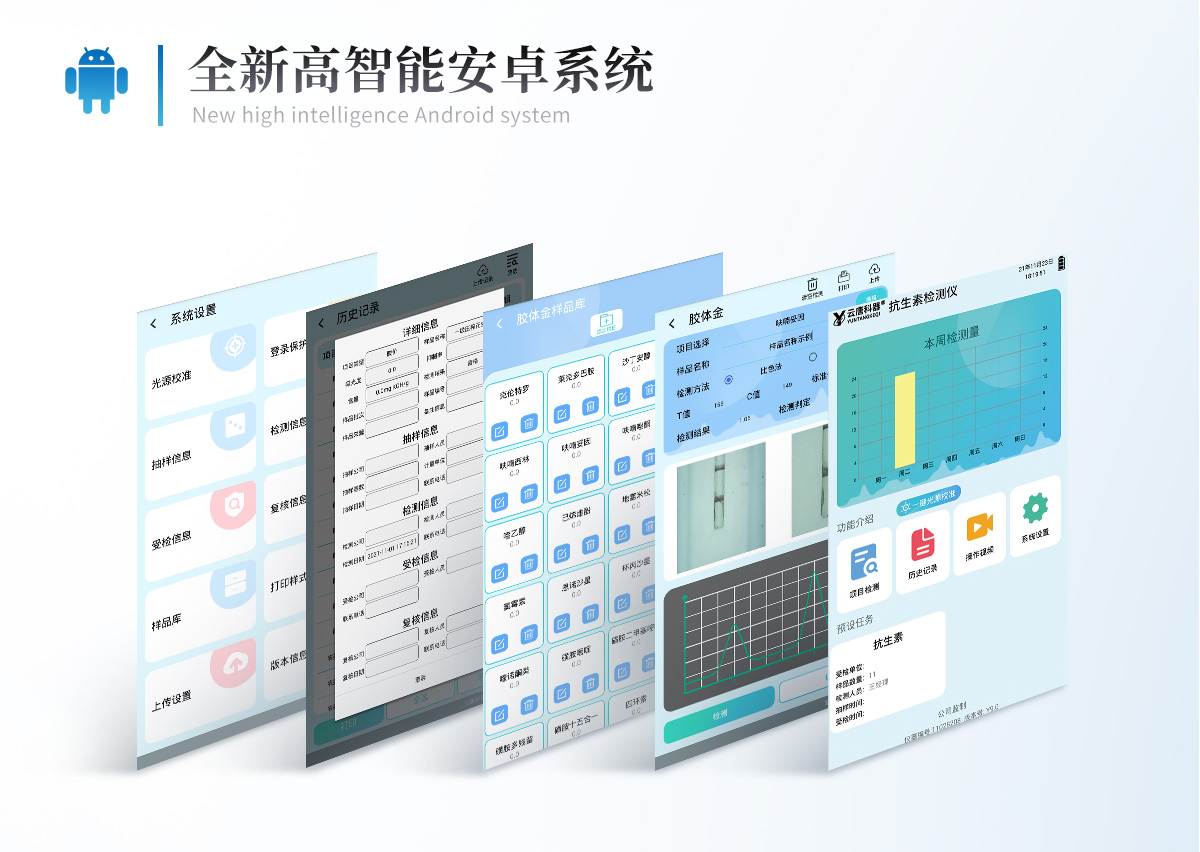 儀器采用10.1英寸液晶觸摸屏顯,搭配運行安卓智能操作系統(tǒng),主控芯片采用ARM Cortex-A7,RK3288/4核處理器,主頻1.88Ghz,運轉(zhuǎn)速度更快速,性能更強。 | 儀器功能包括:膠體金檢測模塊、數(shù)字化管理模塊、無線通訊模塊等,可以滿足同一軟件下實現(xiàn)所有檢測項目的檢測,并在同一窗口展示檢測結(jié)果。 | 一體化便攜式快檢設(shè)備,采用交直流兩用供電方式,可連接車載電源,配備6ah大容量充電鋰電池,可以滿足現(xiàn)場及流動檢測使用的需求。儀器尺寸:43×35×20cm, 主機凈重:5.1kg | 系統(tǒng)自帶數(shù)據(jù)集成模塊,設(shè)備首頁自動統(tǒng)計檢測數(shù)據(jù)包含:周檢測數(shù)據(jù)、月檢測數(shù)據(jù),全部檢測總數(shù)量,均包含檢測總數(shù),合格數(shù),不合格數(shù),以及相關(guān)柱形分析圖,對各項檢測數(shù)據(jù)清晰掌握,無需電腦查詢,更加快捷直觀。 | 儀器具有任務(wù)預(yù)設(shè)模塊,可在樣品送檢前提前預(yù)設(shè)樣品名稱、檢測指標、送檢單位等信息,樣品送檢時一鍵調(diào)取保存信息,檢測更加方便快捷。 | 軌道式自動傳輸掃描方式,可實時顯示金標卡實時圖像,系統(tǒng)自動分析并呈現(xiàn)出CT曲線圖,CT線自動識別,無需手動調(diào)整,完成檢測后自動退出檢測卡。 | 結(jié)果判定線可修改,對照值標定值可保存,斷電不丟失數(shù)據(jù)。 | 兼容市場上其他膠體金卡,使用耗材不受限制,極大增強用戶使用體驗。 | 儀器檢測系統(tǒng)擁有龐大數(shù)據(jù)庫,并且構(gòu)建了完善的檢索、修訂功能。食品庫涵蓋多種樣品名稱,可按需添加或刪除、編輯樣品名稱;產(chǎn)品數(shù)據(jù)庫以及歷史檢測記錄支持一鍵檢索功能。 | 系統(tǒng)打印自定義化,打印格式多樣化,產(chǎn)品合格證(國家標準要求),二維碼,抽樣信息、檢測信息,受檢信息、復(fù)核信息、抽樣日期、檢測日期等信息結(jié)果,可按需求自行設(shè)置打印內(nèi)容。 | A4紙版本報告打印功能(可選配):設(shè)備擁有兩種結(jié)果展示方式,可以自動生成A4打印模板和小票打印模板兩種樣式,可通過WiFi及網(wǎng)線等方式鏈接外置打印機可進行打印 | 儀器具有 wifi 聯(lián)網(wǎng)上傳、RJ45網(wǎng)線連接功能,可以快速上傳數(shù)據(jù)。同步對接監(jiān)管平臺,數(shù)據(jù)可局域網(wǎng)和互聯(lián)網(wǎng)數(shù)據(jù)上傳,檢測結(jié)果直接傳至食品安全監(jiān)管平臺。進行區(qū)域食品安全監(jiān)管及大數(shù)據(jù)分析處理與數(shù)據(jù)統(tǒng)計,檢測區(qū)域食品安全長短期動態(tài),達到食品安全問題預(yù)估、預(yù)警。 | 設(shè)備支持U盤存儲,標準USB接口,免驅(qū)動安裝。檢測結(jié)果存儲容量20萬條以上,可生成Excel表格,進行一鍵拷貝,并具有登錄保護功能,可設(shè)置用戶名及密碼,規(guī)范不同人員操作權(quán)限,防止非工作人員操作,并且可以進行重新校準、鎖定、恢復(fù)出廠設(shè)置功能。儀器固件可升級,后期檢測項目可擴充。 | 儀器具有重新校準、鎖定、恢復(fù)出廠設(shè)置功能。 | 儀器具備遠程升級功能,可定向分客戶分儀器更新,開機后自動更新,并可持續(xù)性免費更新系統(tǒng)版本,無需像傳統(tǒng)產(chǎn)品返廠更新,節(jié)省時間及人力成本并避免了物流運輸返廠升級導(dǎo)致設(shè)備損壞的潛在風險。 |